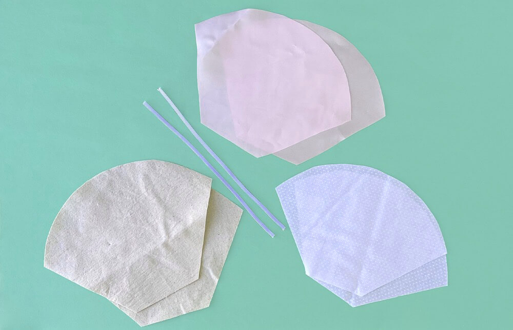 Using the pdf template, cut 2 x Main Fabric, 2 x Lining and 2 x Filter Pocket. Also, cut 2 x 7” pieces of elastic (1/4” or 1/8” works best)