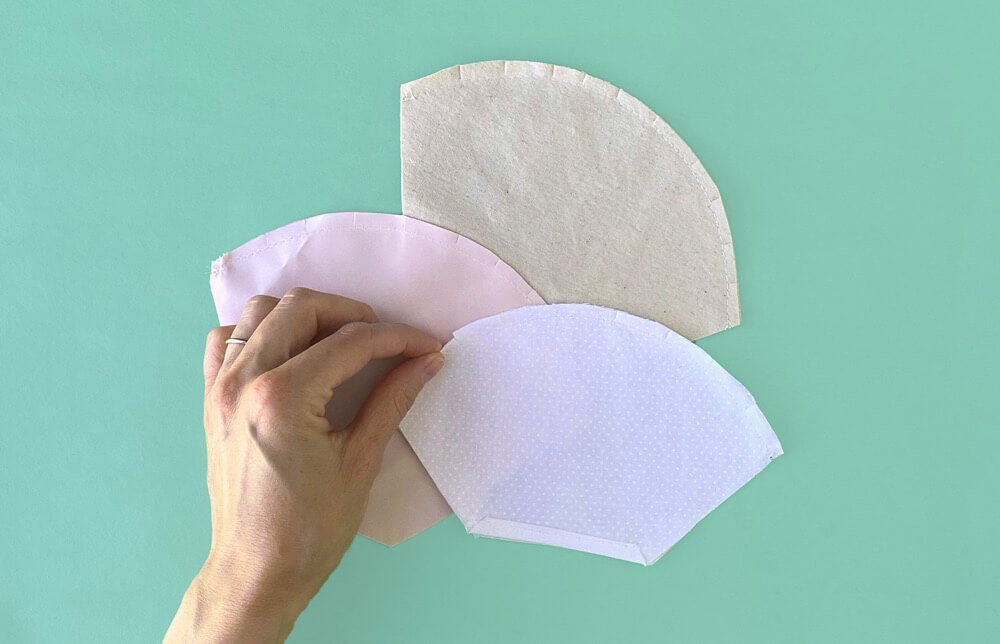 Combine all three pieces as follows and pin in place: Right side of Main Fabric to right side of Filter Pocket. Wrong side of Filter Pocket to right side of Lining.