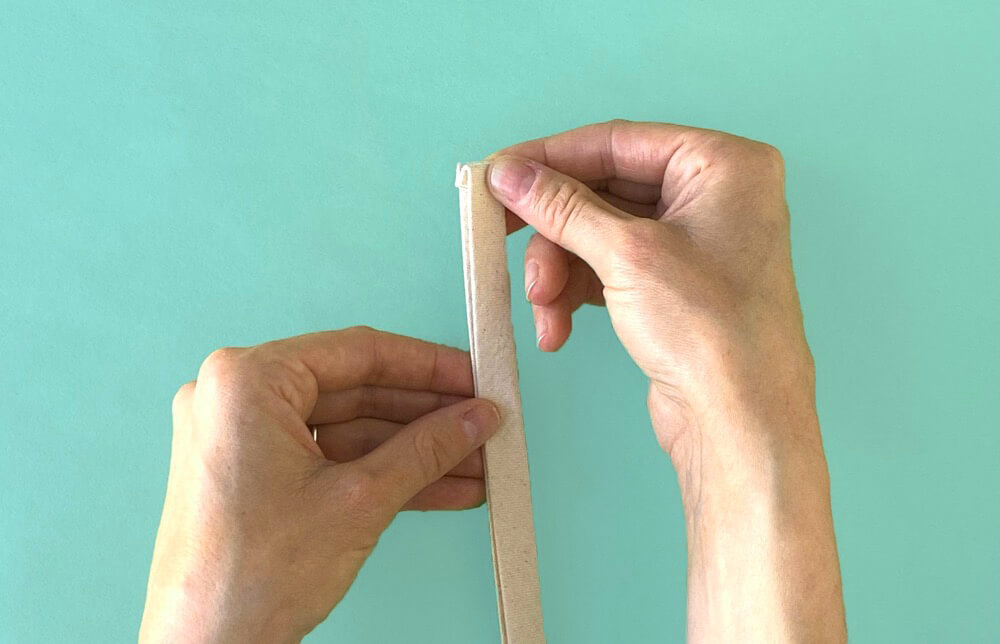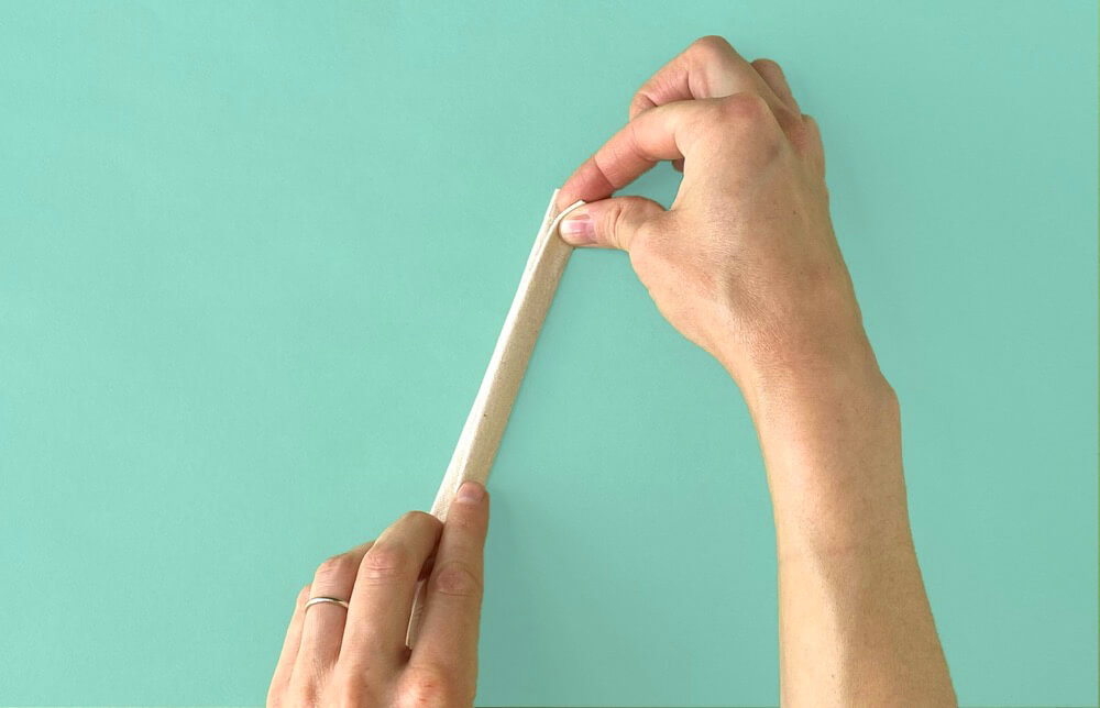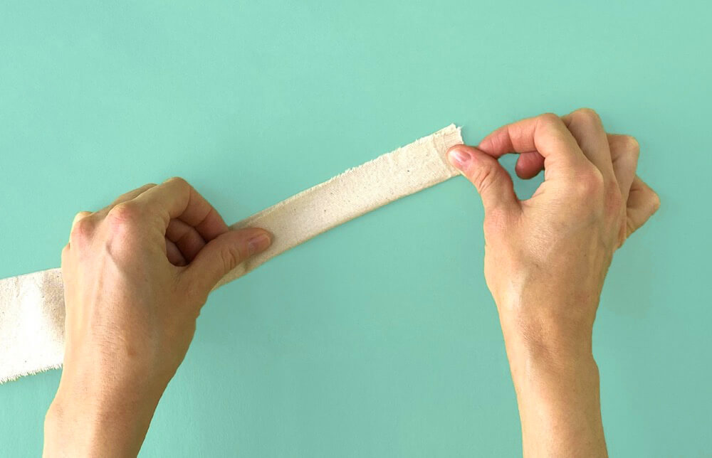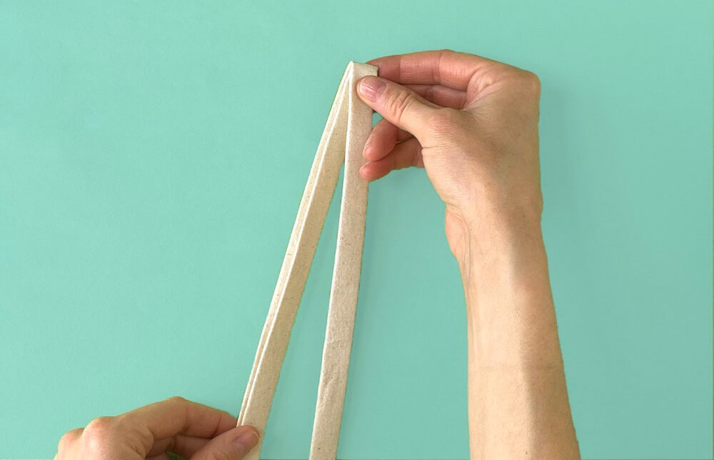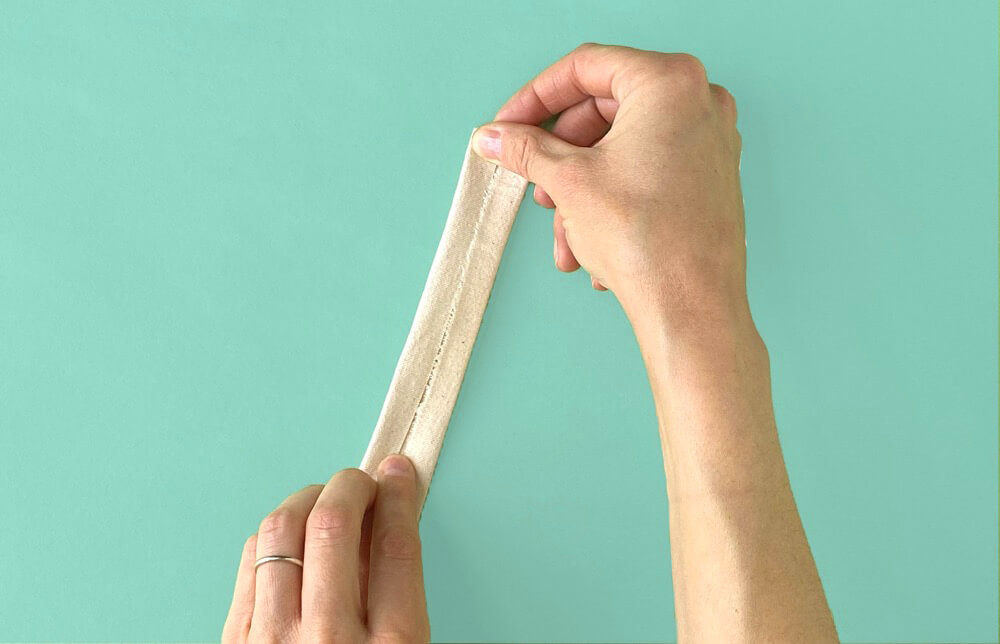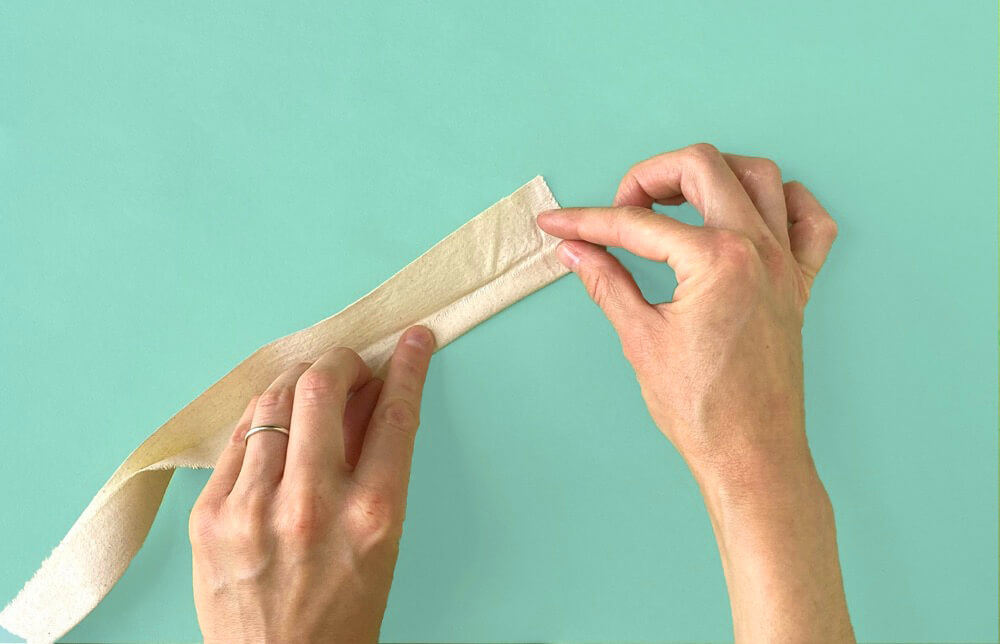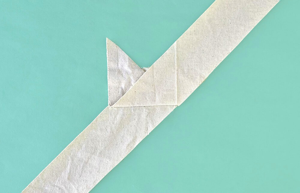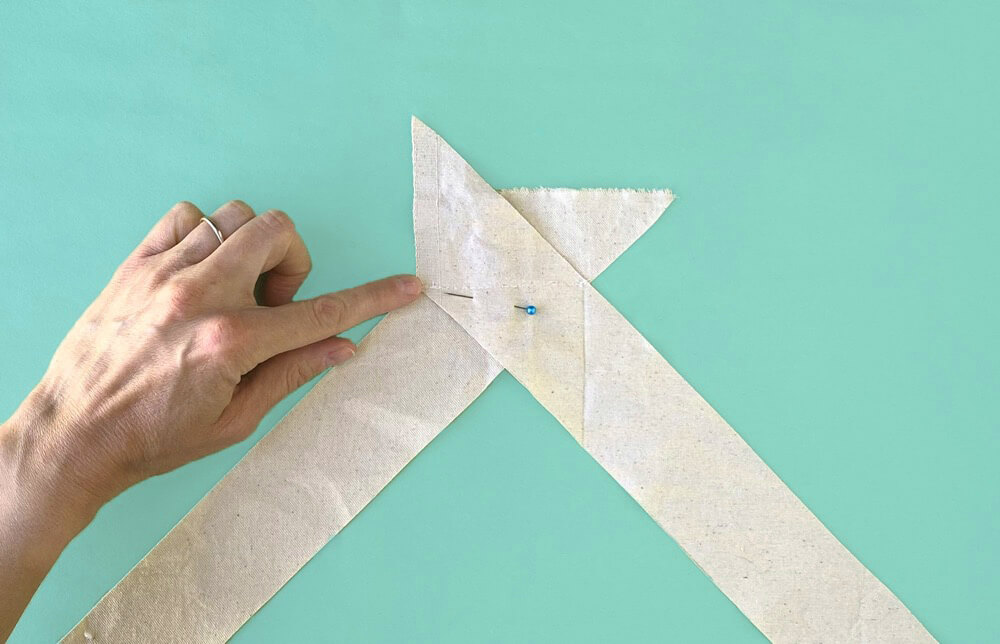 Cut 2 bias ties: 40” x 2” (these MUST be cut on the bias to accomodate curved edges of mask). If you need to join 2 pieces to achieve necessary length, join and sew at a 90 degree angle as shown.