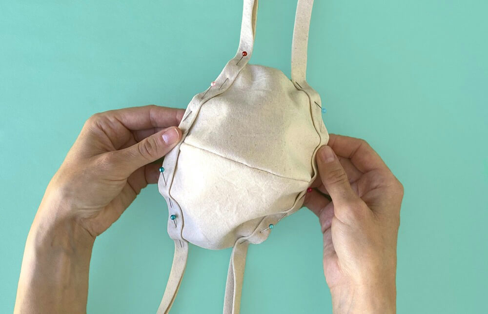 Lining up middles, pin both ties to mask and sew along entire length of the tie being careful to catch all layers as you sew.
