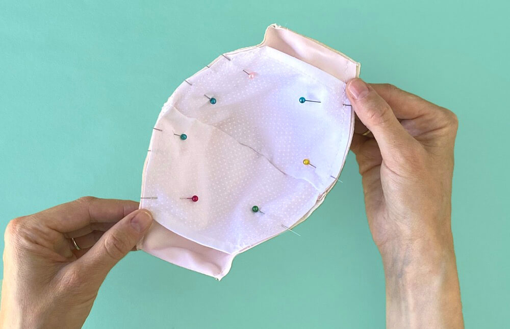 Turn inside out and pin Filter Pocket into mask (Wrong side of Filter Pocket facing right side of Lining Fabric). Sew a stay-stitch along both long edges.
